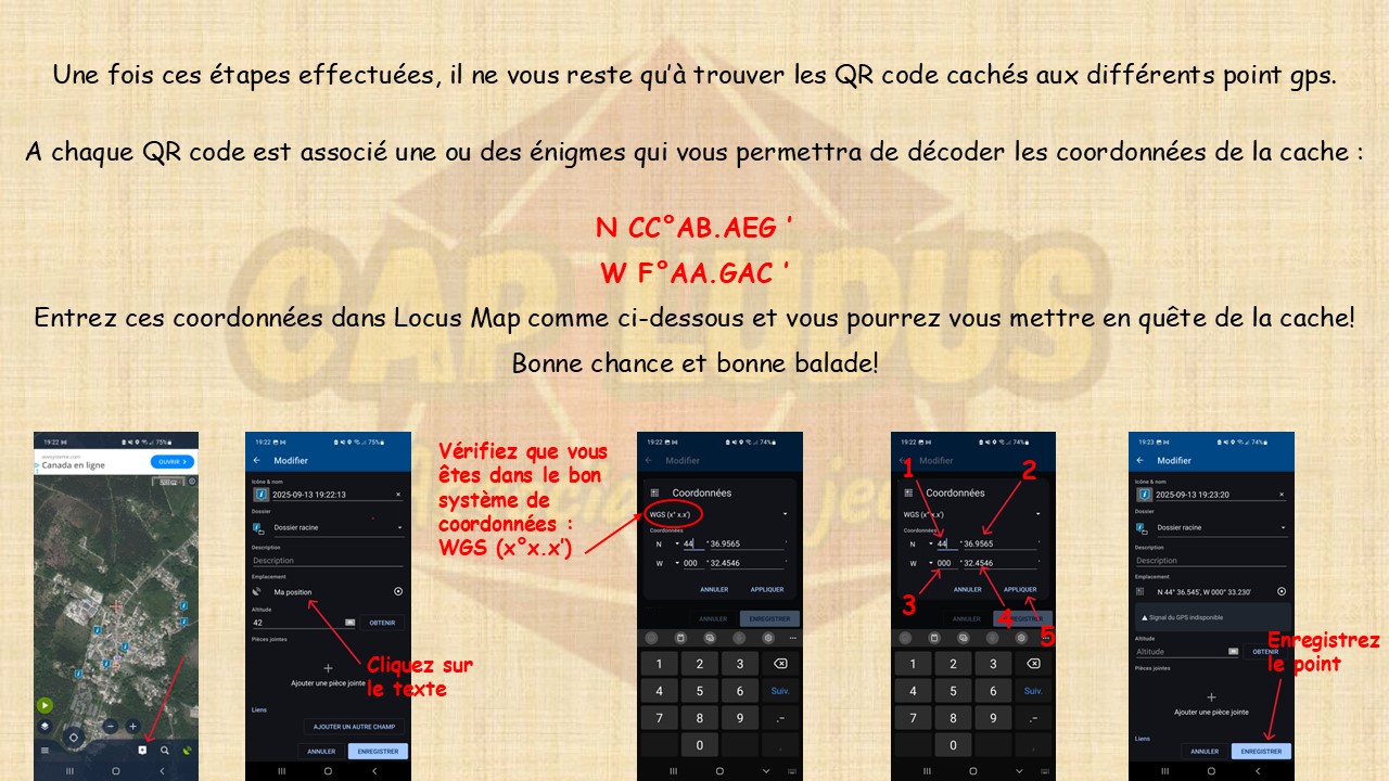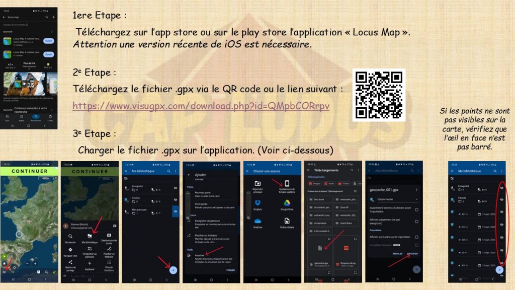 Le tutoriel que vous trouverez sur les images qui suivent, vous permettra de suivre le parcours via l’application « Locus Map », mais vous pouvez utiliser toute autre application vous permettant de lire un fichier .gpx