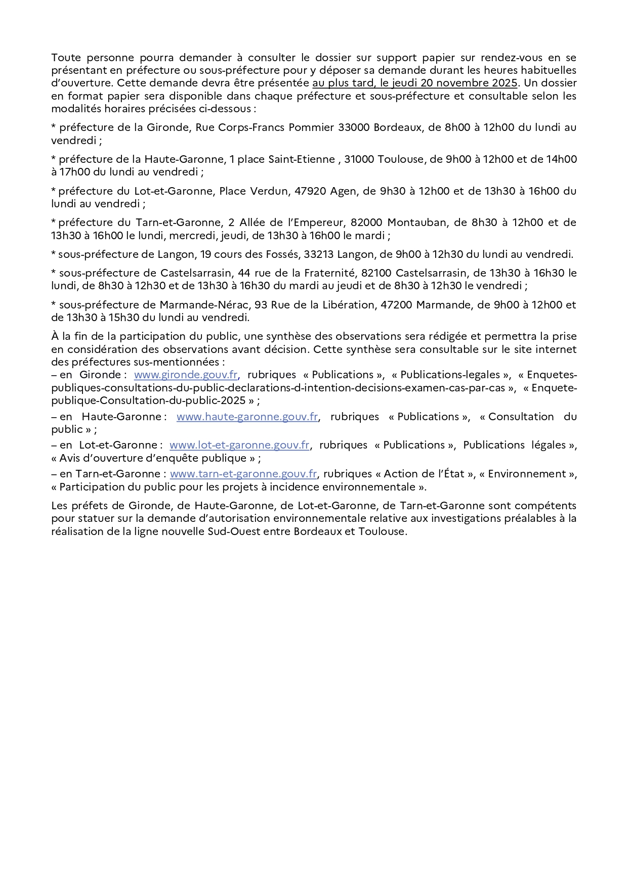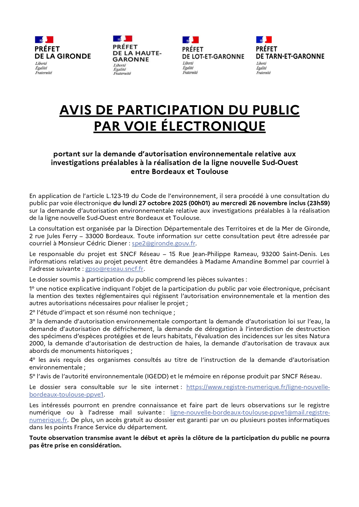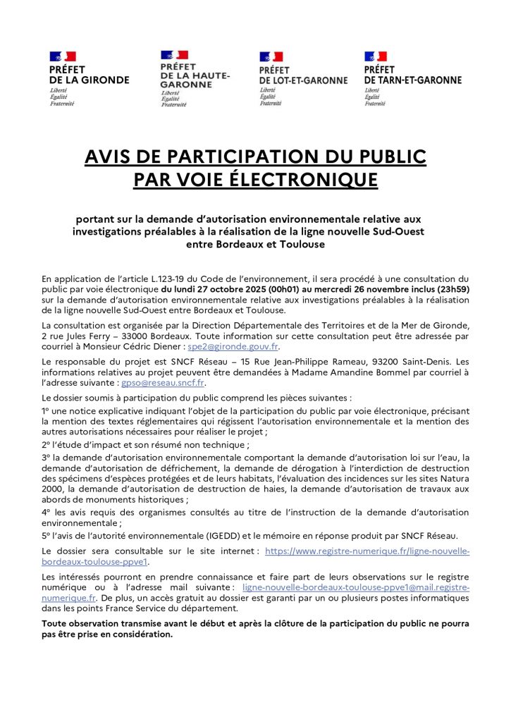En application de l’article L.123-19 du Code de l’environnement, il sera procédé à une consultation du public par voie électronique du lundi 27 octobre 2025 (00h01) au mercredi 26 novembre inclus (23h59) sur la demande d’autorisation environnementale relative aux investigations préalables à la réalisation de la ligne nouvelle Sud-Ouest entre Bordeaux et Toulouse.