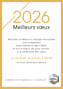 Monsieur le Maire et l’équipe municipale vous présentent leurs meilleurs vœux 2026 et ont le plaisir de vous convier à la cérémonie des vœux qui aura lieu le vendredi 16 janvier à 18h30 au Foyer (place Saint-Martin).
