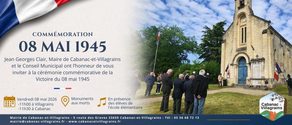 Jean Georges CLAIR, Maire de Cabanac-et-Villagrains et le Conseil Municipal ont l’honneur de vous convier aux cérémonies commémoratives de la victoire du 8 mai 1945 qui auront lieu aux Monuments aux Morts de la commune :