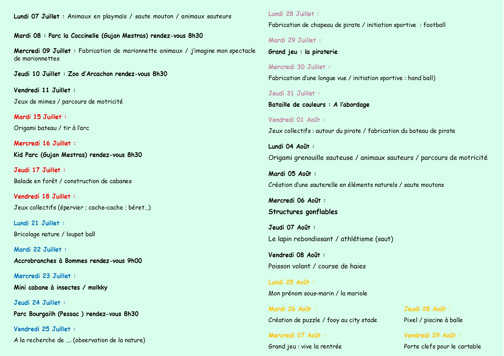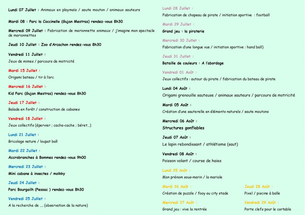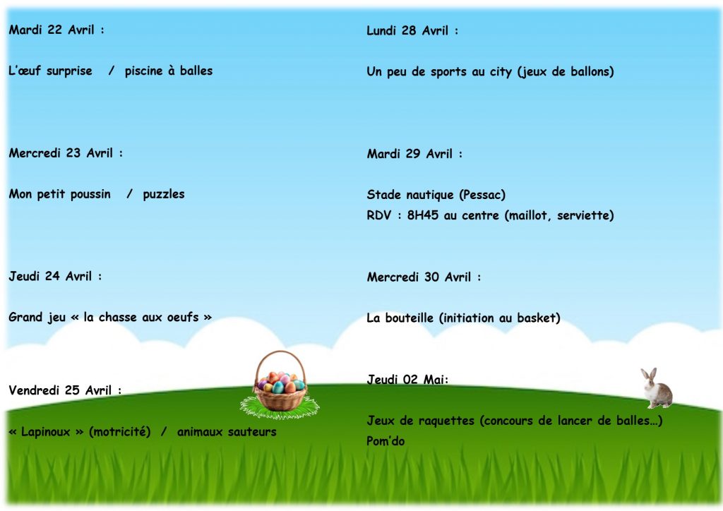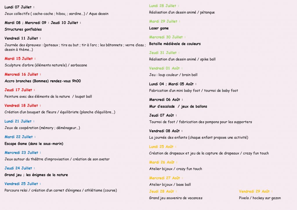 - durant les vacances de 07h00 à 18h30 aux écoles Maternelle et Élémentaire.