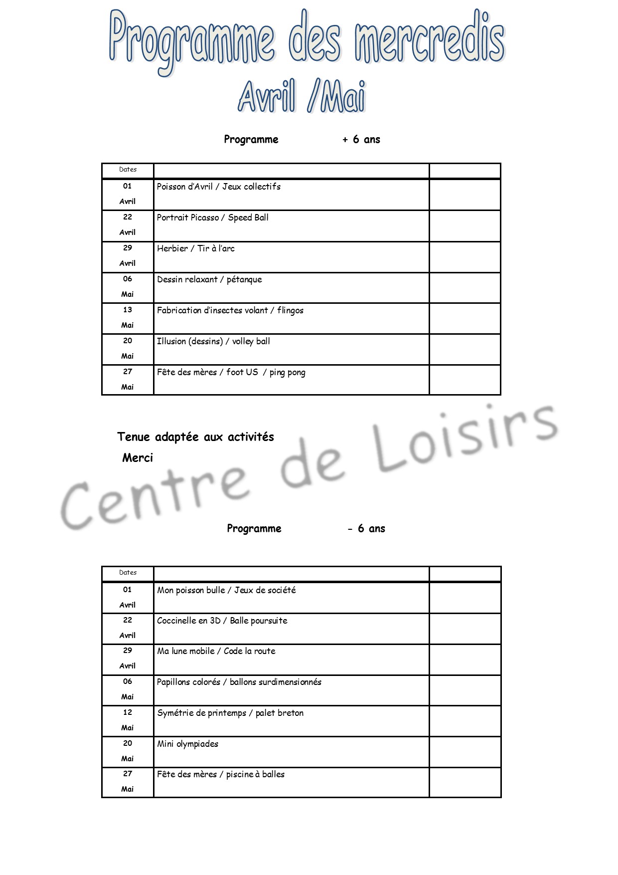 Programme des plus de 6 ans :