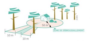 Pour les terrains situés à moins de 200 m des bois et forêts, l’obligation de débroussailler s’applique sur :