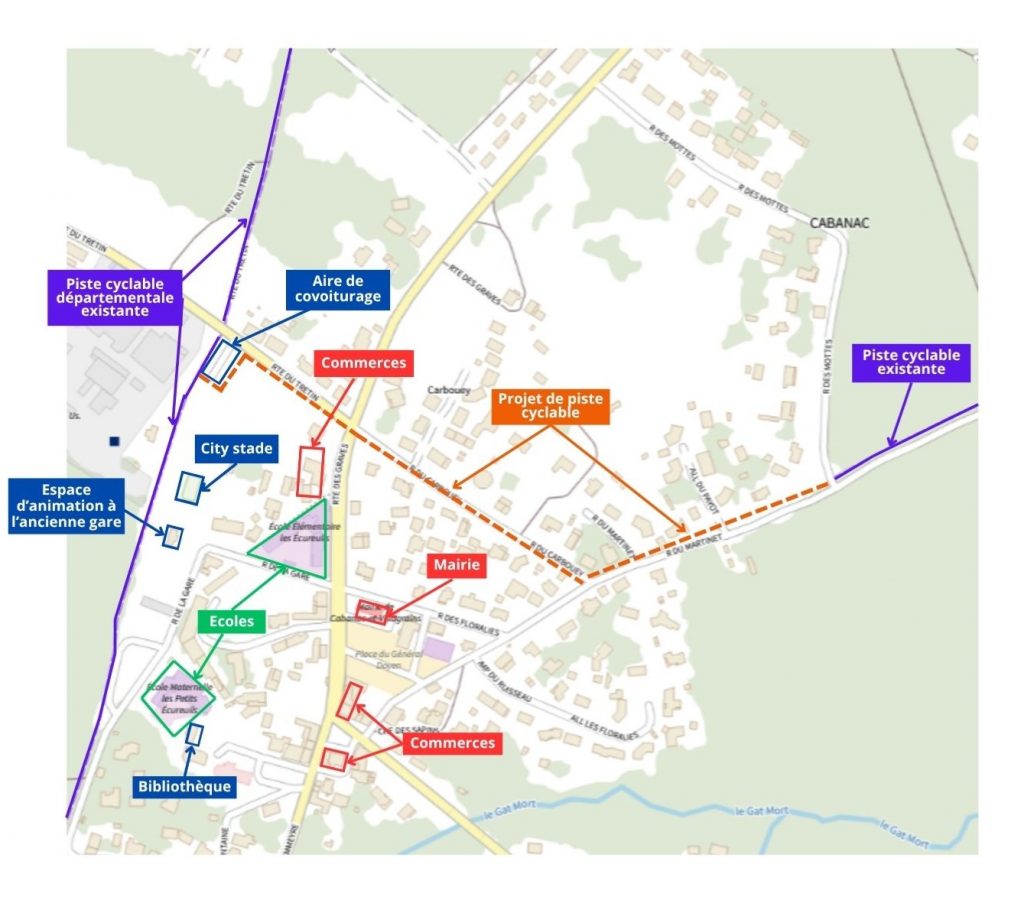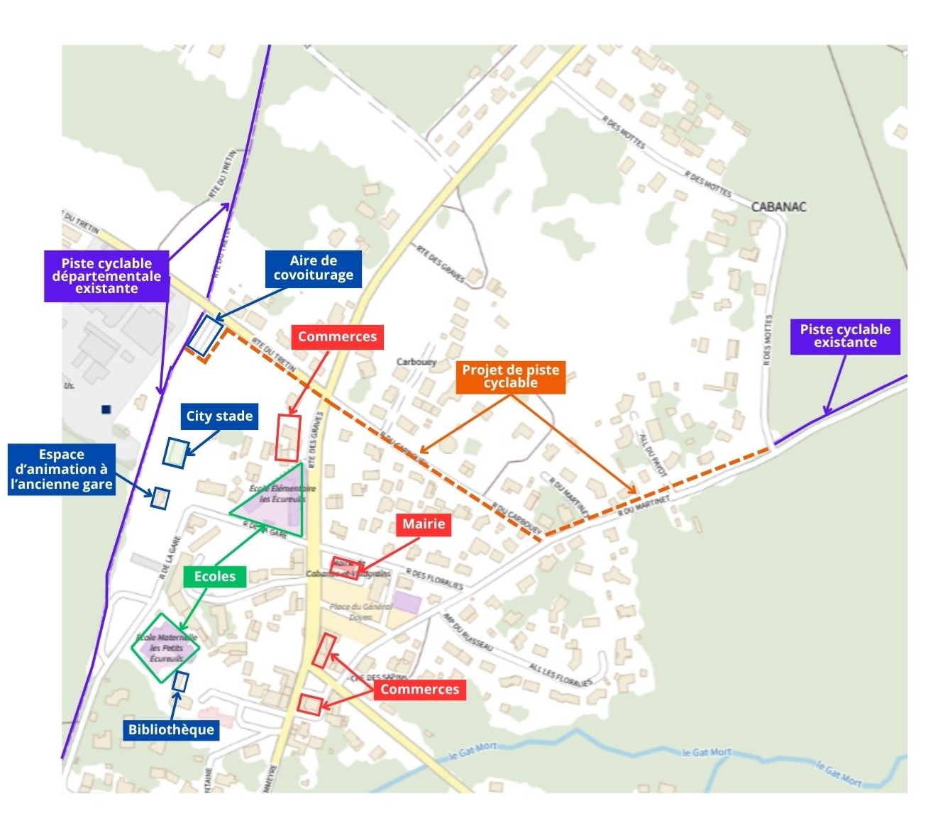 Cet aménagement s’inscrit dans la continuité de la piste cyclable existante de la rue du Martinet, qui dessert les quartiers de Gassies et de l’Entre-deux-Mers, et permettra de relier plusieurs équipements structurants de la commune :